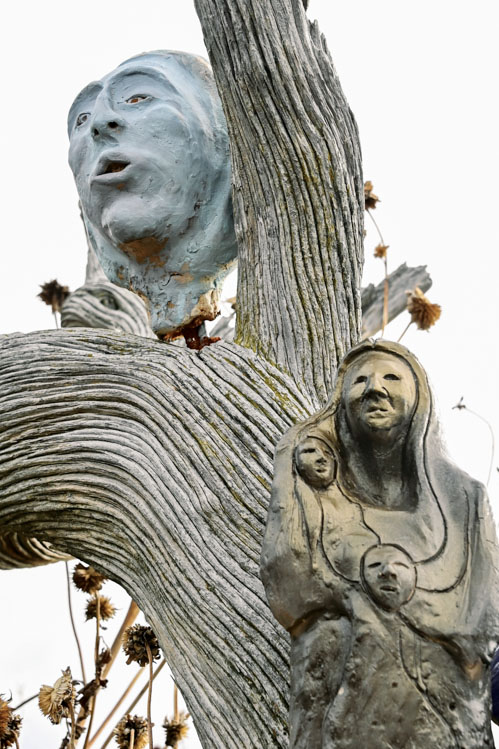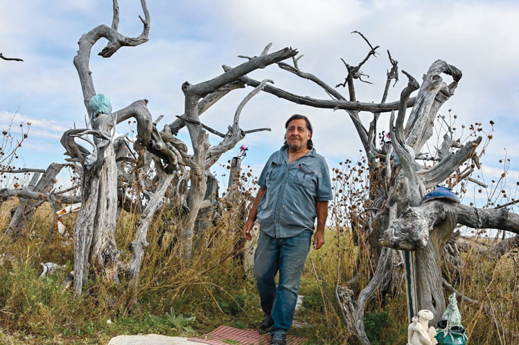 When a neighbor’s cattle trampled his yard and damaged some tipis that he had created as mini studios, he started a fence of driftwood to keep out the cows. Soon he assimilated art into the fence. Often, his pieces show faces of figures, perhaps in a spiritual search. Maybe they represent relatives who were driven from Cuny Table generations ago, or ancestors who were killed at Wounded Knee, which is just 20 miles to the east.