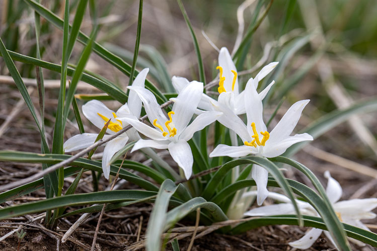 Star lilies in bloom along a trail of the Sage Creek Wilderness in Badlands National Park.
