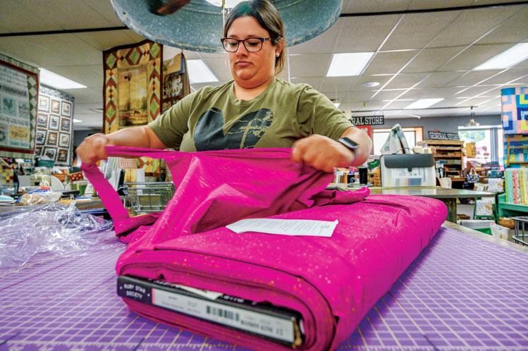 | Mariah Baumberger cuts fabric in her mother's store, Always Your Design, an anchor of the business district in Dell Rapids. |