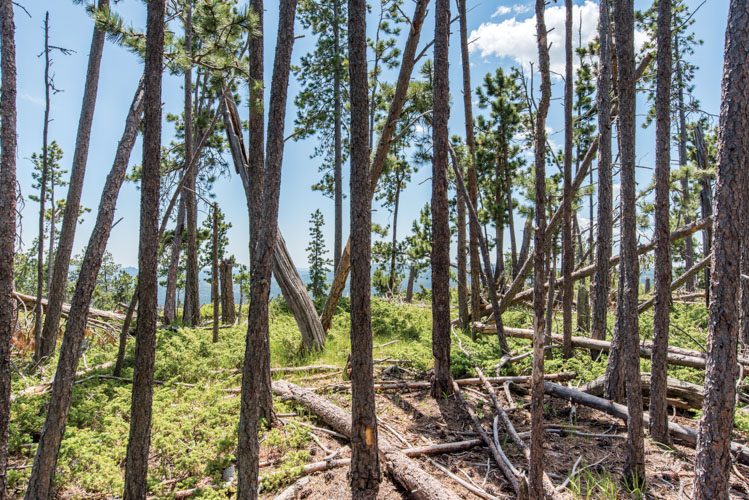 Traffic along the highways and at Sylvan Lake was busy with tourists, but few people make the hike up Sylvan Peak. Though it’s only about a mile and half to the summit, there is no dedicated trail and downed timber is strewn all over the hillside. “It was constant hopping from dead tree to dead tree to rocks. It was really hard because there was no smooth trail or even a meadow to walk in. It was just pure downed timber.”
