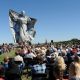 South Dakotans saluted and welcomed Dale Lamphere’s Dignity sculpture on a Missouri River bluff above Chamberlain on Saturday. Photos by Bernie Hunhoff.