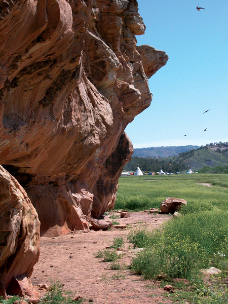 The hilltop ceremony will last two more days, but in late afternoon I leave for home. At a rocky promontory nearby, I pull off the dusty track, shut off my car’s engine and step outside. My eyes drift down the bouldered scarp to the distant river bottom where, far below, seven huge white pelicans slowly flap along the winding Cheyenne, casting dark shadows on its muddy waters. Beyond, the rim rock mesas glow red and tan and the firmament above shimmers cobalt blue. Far to the north, evening thunderheads are blooming above the Black Hills.