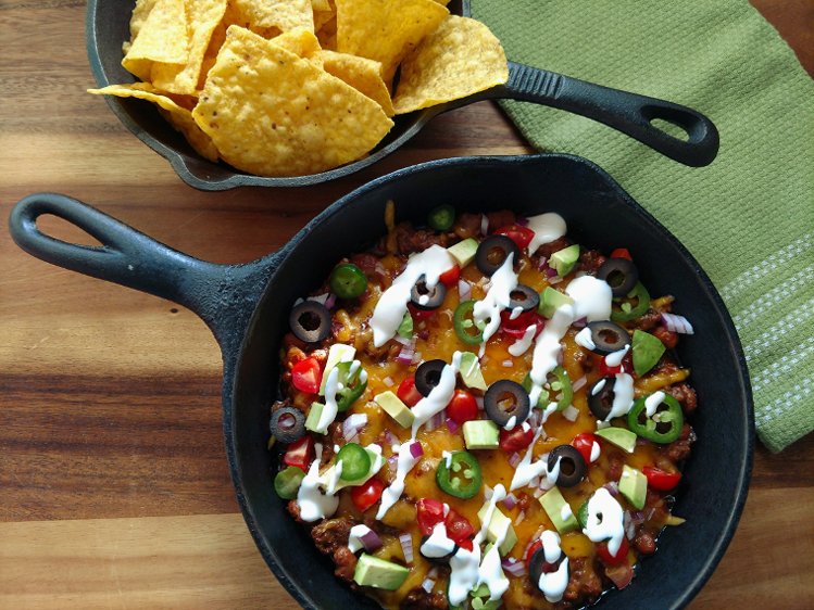 I have previously shared that I am probably the least athletic person alive, and aside from following our local high school team enough to not embarrass myself while subbing, I am not a sports fan by any measure. However, I am told that the upcoming Sunday game is more about the food than anything else. So, here I am, cheering from the sofa with a vat of nachos in front of me. My version of Skillet Nachos is much like a warm variety of Seven-Layer Dip. It has seasoned beef and beans, melty cheese and all the toppings you have been dreaming of digging into with crispy tortilla chips. Turn on the game, or not. It doesn’t matter to me. Just enjoy the nachos.